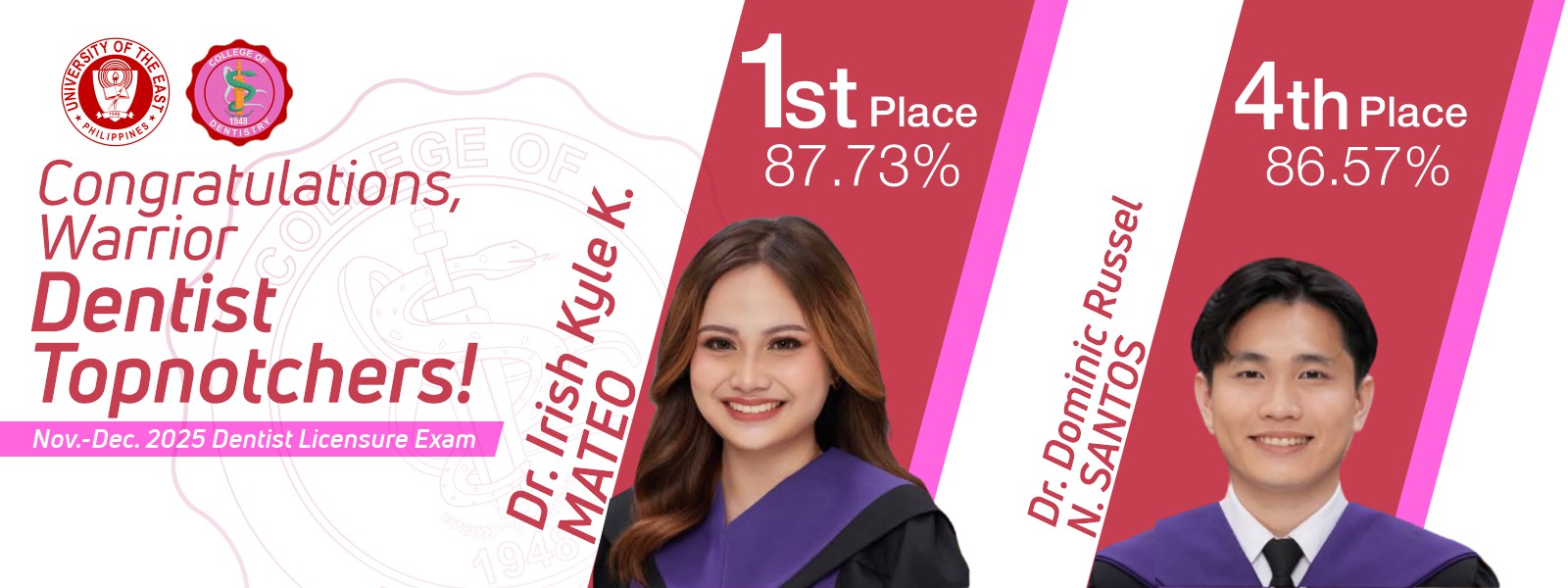 The University of the East College of Dentistry has produced not one but two topnotchers in the recently concluded licensure examination for dentistsโled by 1st Place topnotcher Irish Kyle Katipunan Mateo, who bested all examinees nationwide with an overall rating of 87.73%!