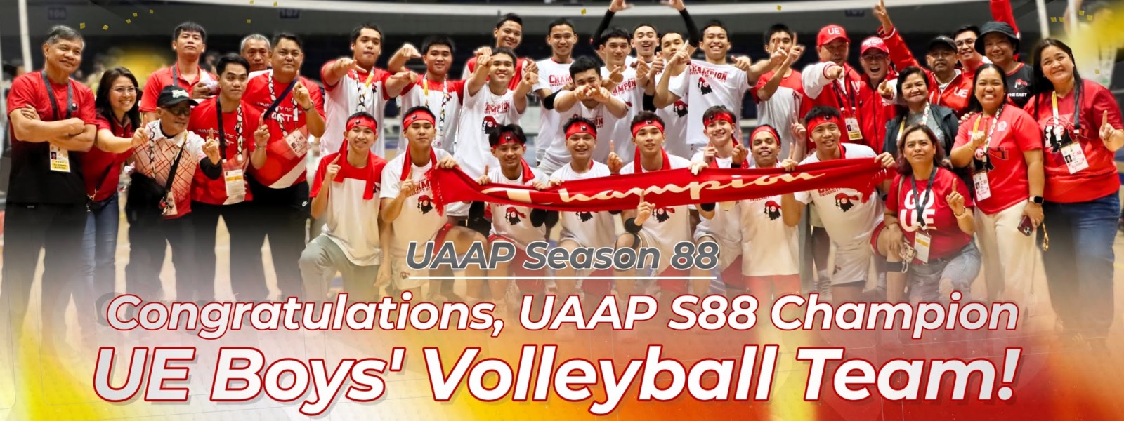 Making history after 11 long years, the UE Boysโ Volleyball Team reclaimed the championship crown in the UAAP Season 88 High School Boys' Volleyball Tournament after outlasting the NUNS Bullpups in a complete sweep, 28-26, 25-23, 25-19 today, December 14, at the Ateneo Blue Eagle Gym.